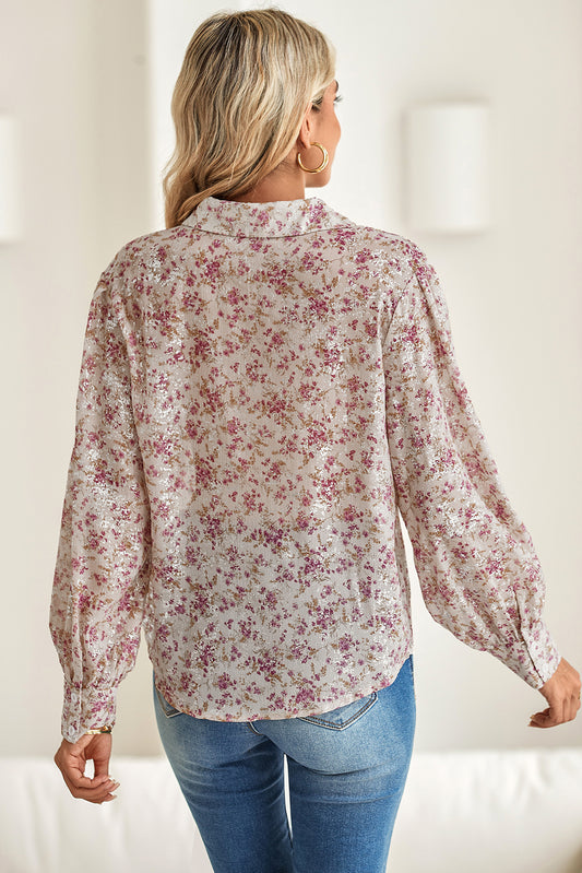 Pink Ditsy Floral Print Bishop Sleeve Collared V Neck Shirt